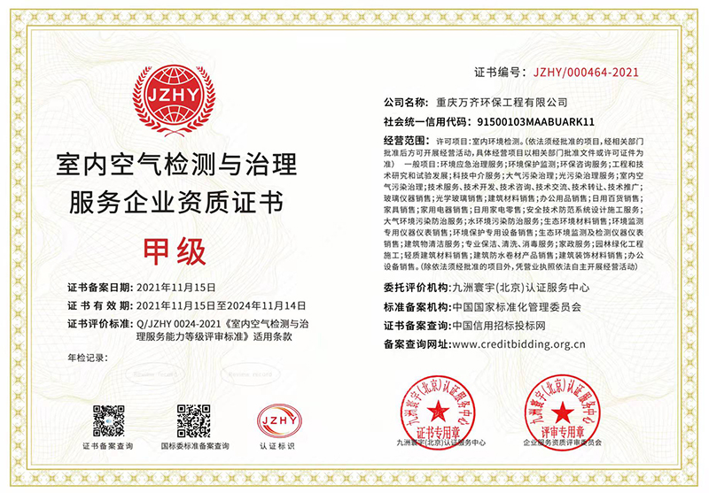 重庆万齐环保工程有限公司位于美丽的山城重庆,注册资金500万元,地址位于重庆市渝中区七星岗街道中山一路85号,本公司是一家年轻化公司,专注于室内环境检测;室内空气污染治理:技术服务、技术咨询、技术交流、技术推广;环保咨询服务:消毒服务;建筑物清洁服务:外墙清洗、外墙排危、大型开荒清洁;玻璃修复;